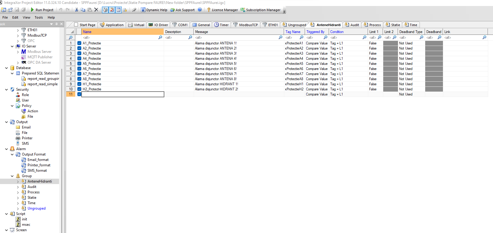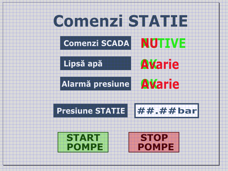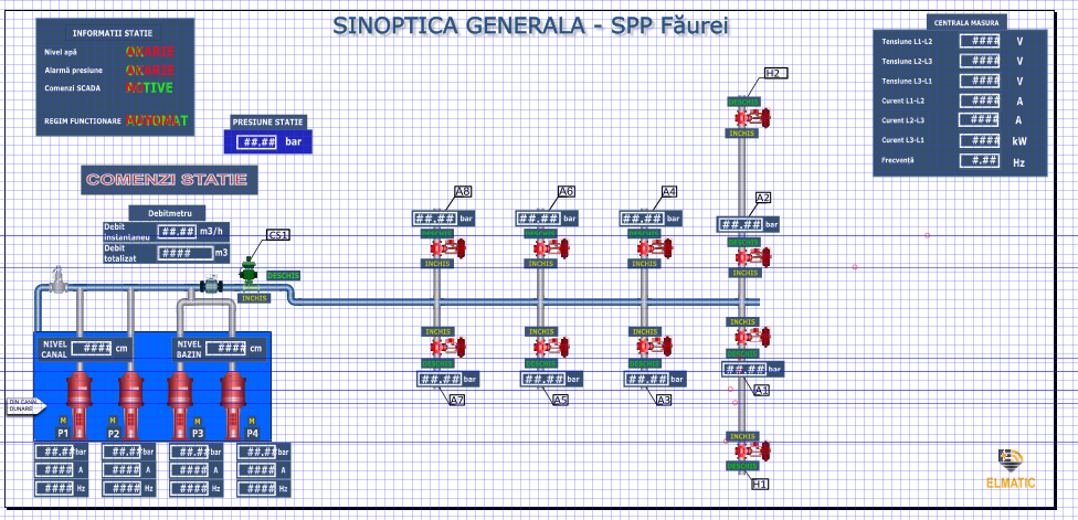 Implementarea unui sistem local SCADA pentru monitorizarea și controlul unei stații de pompare a apei în sistemul de irigații, de pe raza județului Brăila. Aplicația trebuie să permită vizualizarea celor mai importanți parametrii din stație dar și din teren – antene, hidranți.